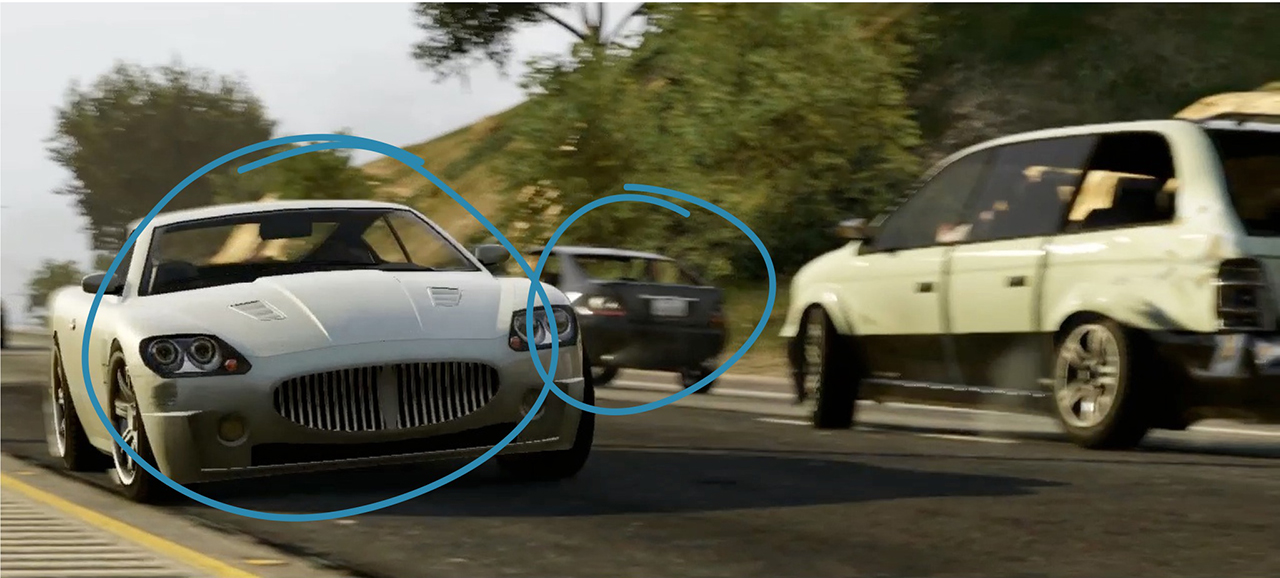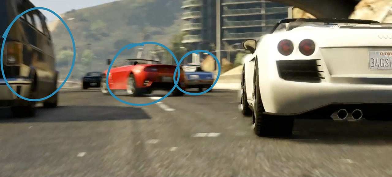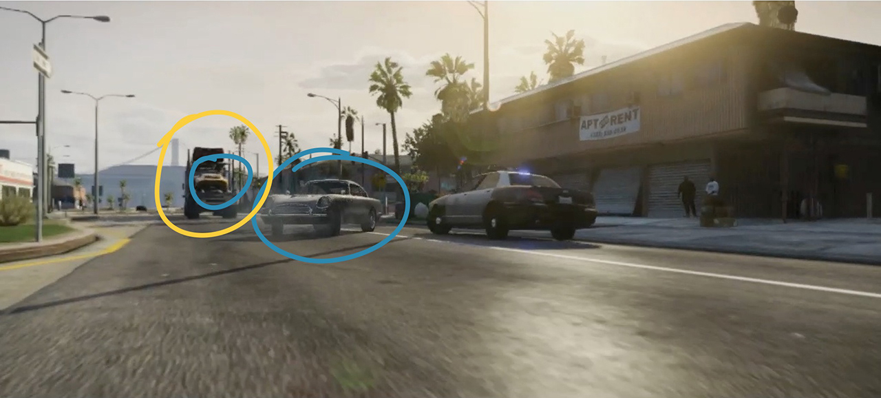 Franklin and Lamar now weave their way through Los Santos traffic, Franklin still in the 9F and Lamar in the same Aston Martin crossed with a new Jaguar F-Type, and a hint of Nissan 350Z thrown in that was seen in the first trailer, he narrowly avoids colliding with what looks like a convertible Manana or Esperanto, on the left looks to be a variant of the Moonbeam.
