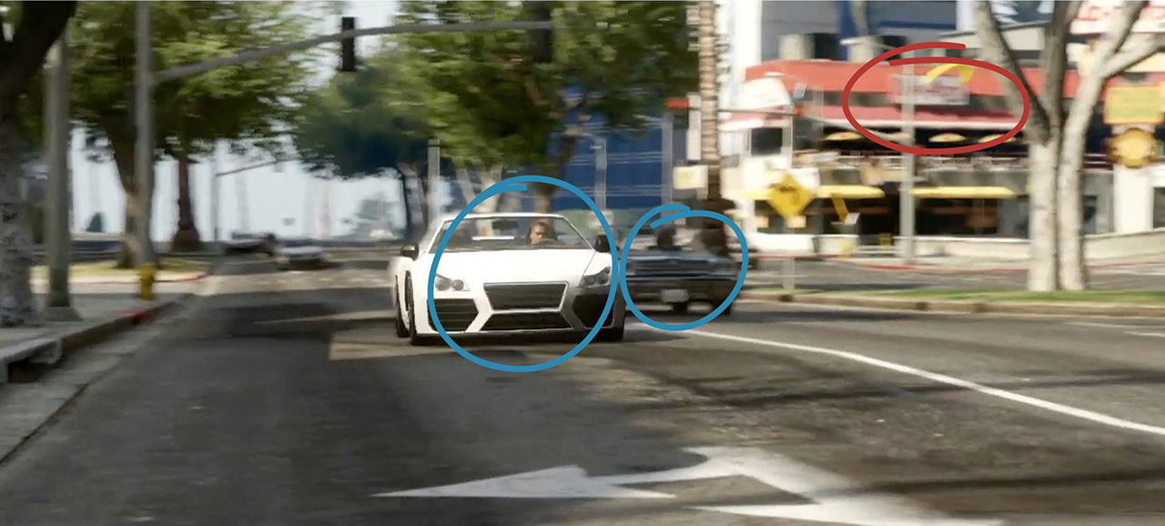 As this scene continues, Franklin in the 9F drives past a vehicle with similarities to some of the lowriders in San Andreas, possibly the Savanna or Blade. An Up-n-Atom Burger restaurant can be seen in the background.