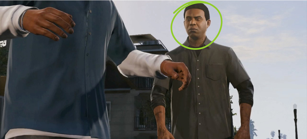 Another angle of the same scene with Franklin and Lamar, we can see in the background the same house we see them in front of with Michael earlier, maybe this scene is chronologically set before the earlier scene where they repossess the 9F sports car.