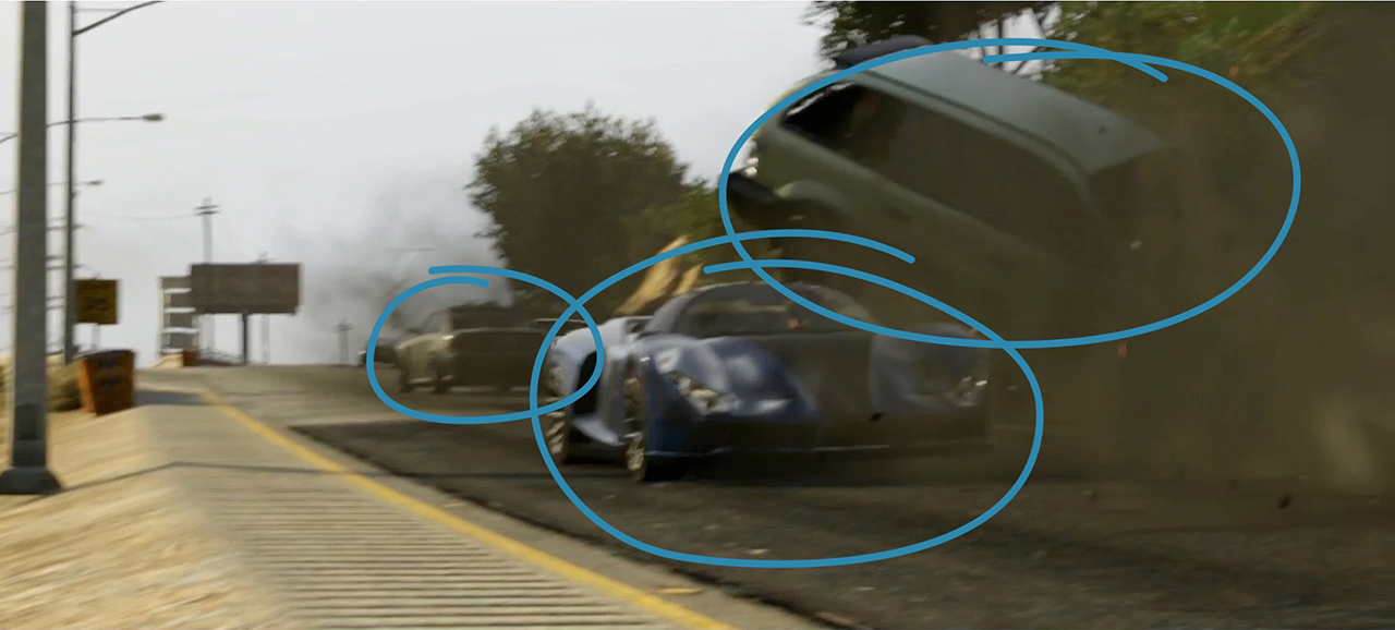 The next scene shows a car resembling a Pagani Zonda and Ferrari Enzo, smashing into a Minivan, sending it flying. The car in the background appears to be an IV era Sentinel, but it's hard to tell, it could just be a hard top variant of the V era Sentinel, but it would be nice to see both in the game.