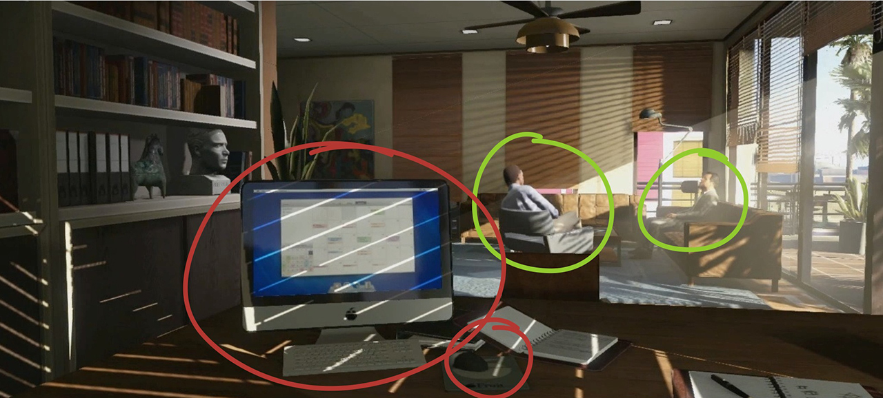 The trailer now heads back to Michael, he is seen here sitting with another man in what appears to be a therapist's office, the computer on the desk looks to be based on the Apple iMac and OS X operating system, the mousepad reads 'Fruit' with a logo of a fruit bowl, a reference to the apple in Apple's logo, which is odd considering the phone held by the bikini girl in the artwork is called an 'iFruit', this would mean the phone would be called a 'Fruit iFruit'.