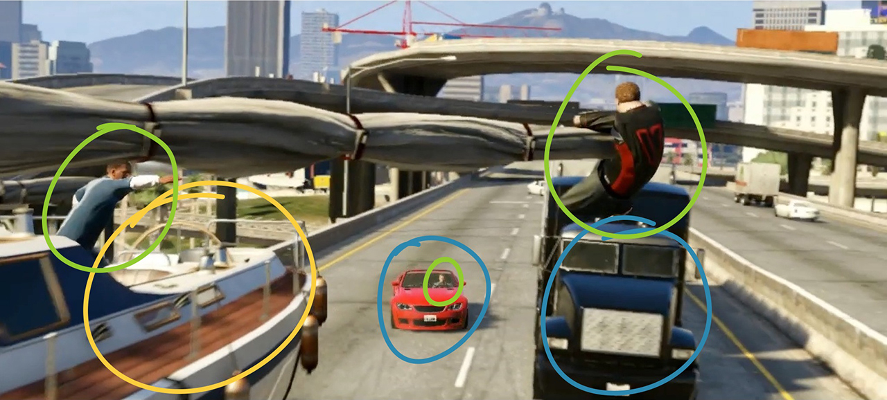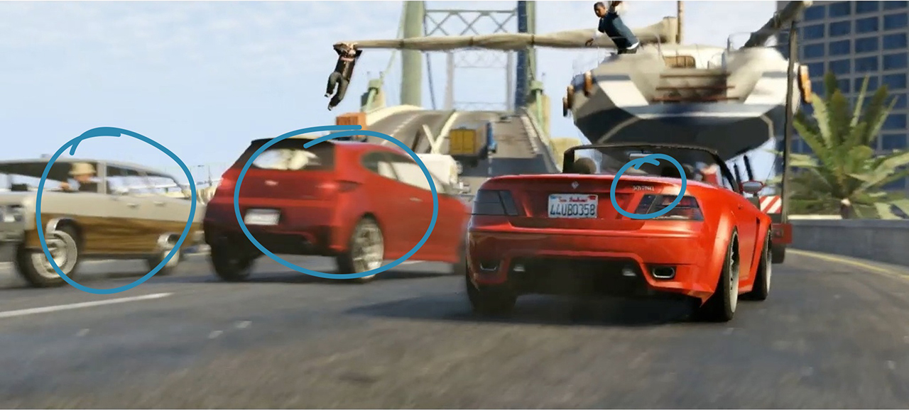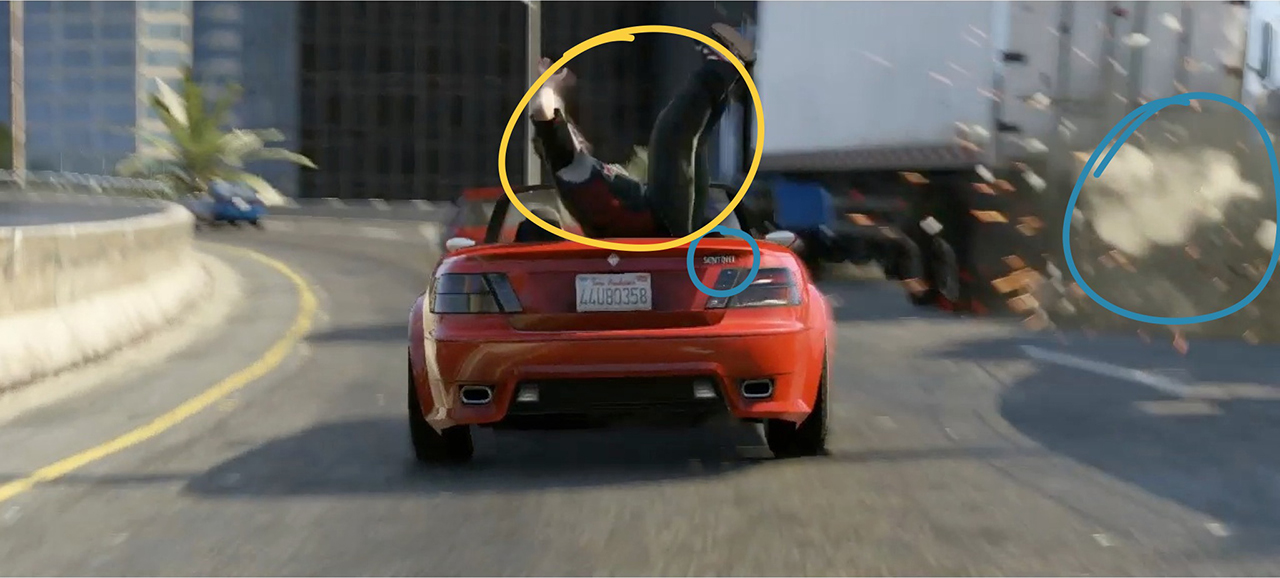 This next shot must take a place a couple of minutes after the previous as the background would indicate they have already passed over the bridge, as Jimmy falls into the back of the Sentinel convertible, could this be an indication of an improvement in physics, could running someone over end up with them landing in your back seats, or could you potentially jump into the back of a moving car. Also to the right a Dilettante hybrid car, based on the Toyota Prius, is seen as it gets crushed between two trucks.