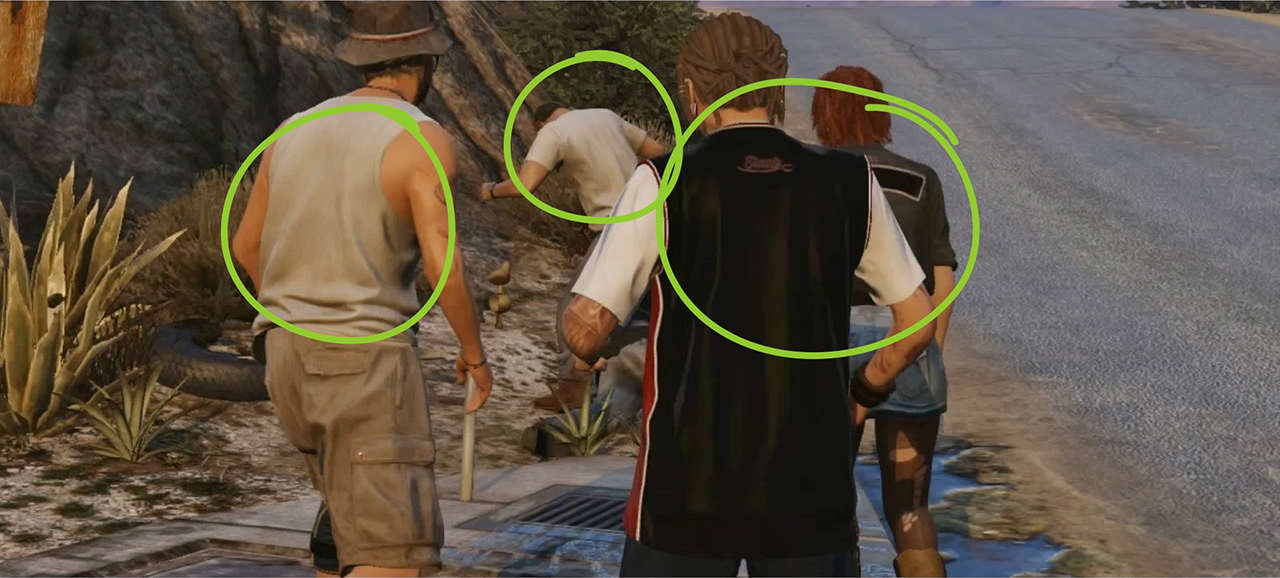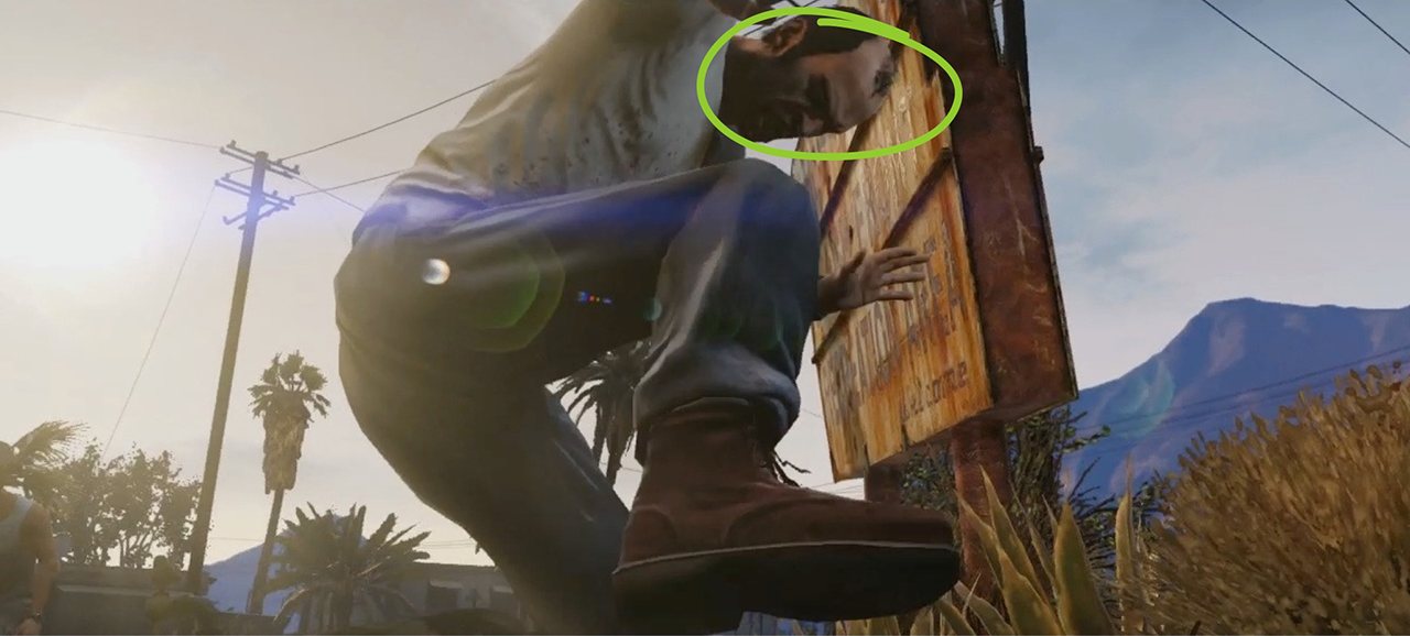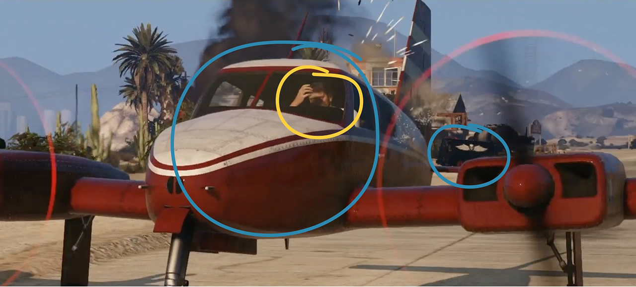 Still with Trevor, we see him in a plane on an airstrip in the desert, Trevor is an ex-pilot so he'll be the one doing the majority of the flying. Behind him we see gang vans, with red wheels and a red spoiler, on the vans a logo of a skull and wings can be seen, this is the same logo seen on the Slamvan's in The Lost and The Damned belonging to The Lost MC. Rockstar have said there may be some cameos from characters in IV so maybe The Lost is who they were referring to. There is also one of these vans chasing the plane, but it's hidden behind the plane at this angle, the men in the vans are shooting at Trevor as a plume of smoke billows up into the sky from behind, we can see Trevor duck and shield his face as the bullets hit the plane, another hint towards dynamic character animations.