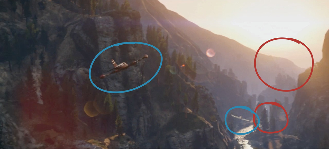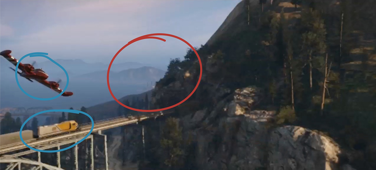 After escaping the gunfire Trevor flies the plane, which now has it's landing gear raised, over a train crossing a bridge, we can see mountainous terrain way off into the distance in this direction.