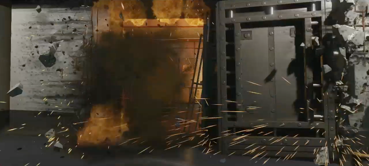We are now shown a small clip from one of the games many big heists, as we see a vault door blown open and smash into the wall sending debris flying.