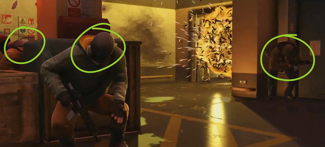 In a brief clip of another mission we see one of our characters smashing the glass case in what appears to be a jewelery store, this is probably a cut scene from the same mission we saw part of on the first trailer as they turned up outside building in a van decked out with masks and guns.