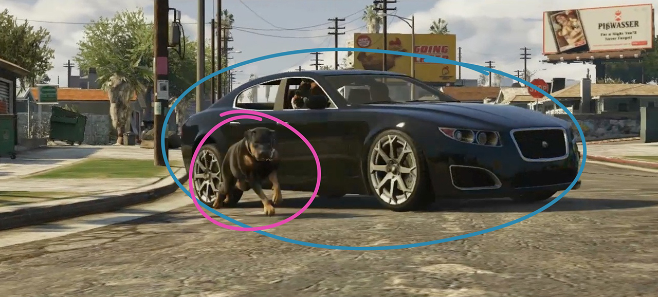 Back out on the streets we see a dog that looks like it could be a breed of Bulldog or Rottweiler sprint across the road as a car resembling a Jaguar XF and XJ powerslides to a halt while the occupants are firing handguns towards the camera.