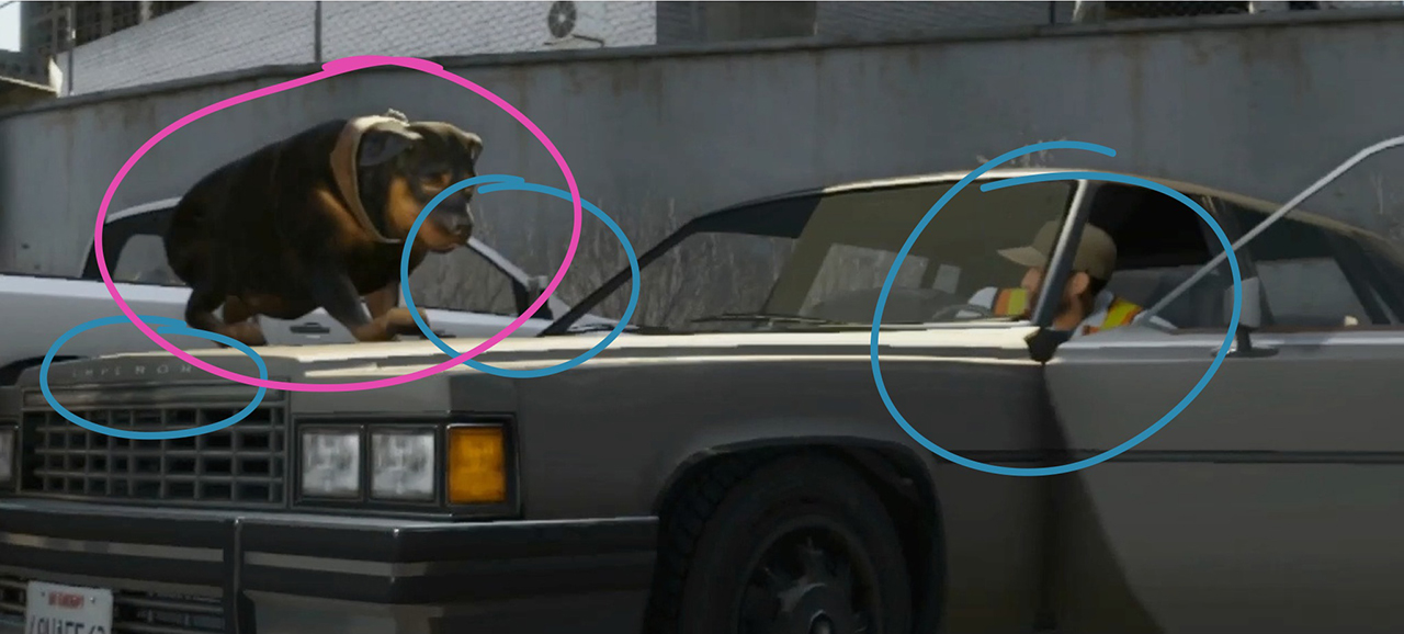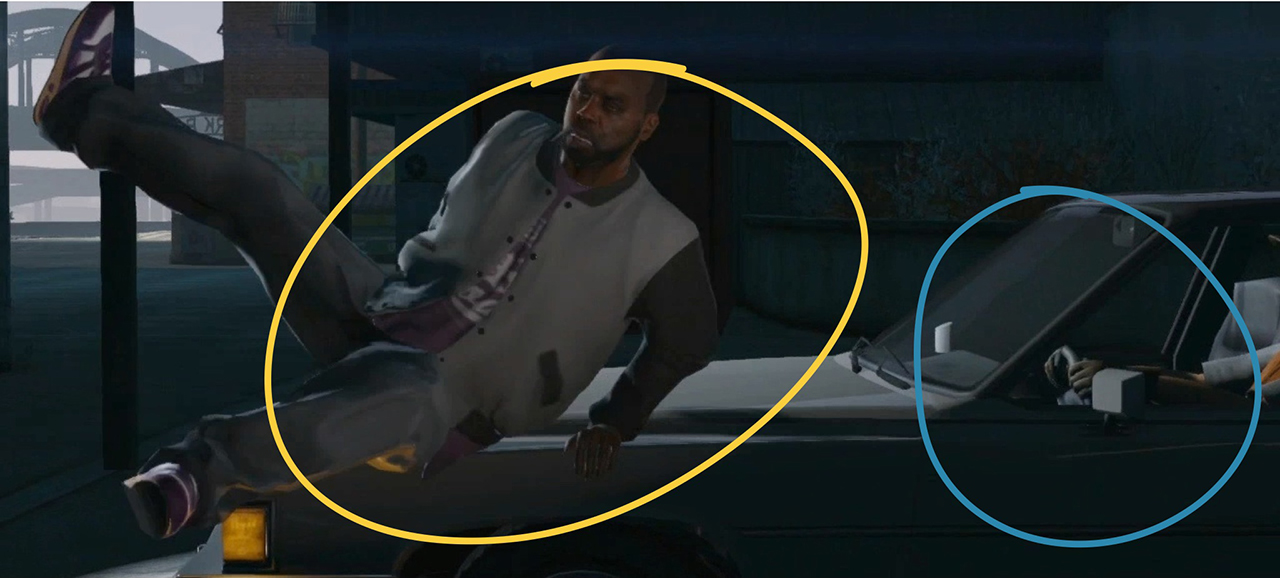 This shot is a quick clip of an NPC leaping over the hood of a car being driven by a guy in a florescent vest, yet another hint towards those possible dynamic animations that I keep mentioning.