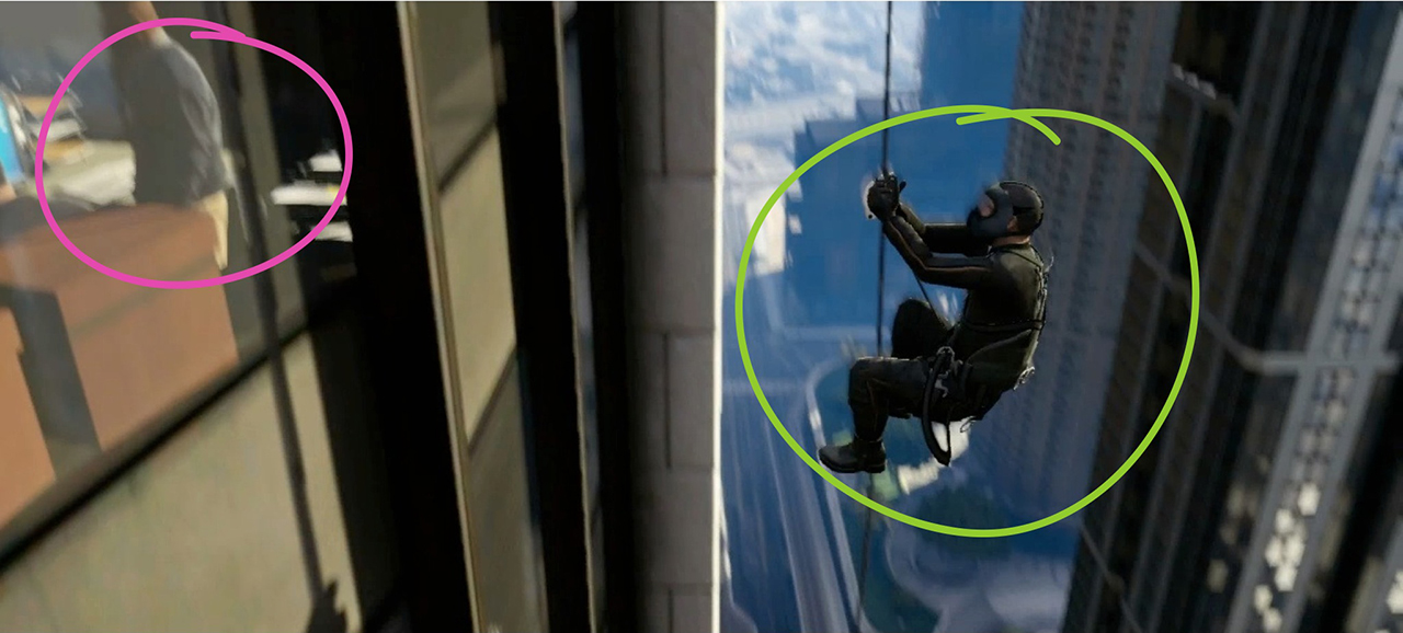 Moving on, we see Michael rappelling down the face of a large office building in downtown Los Santos as part of a mission for the FIB, Grand Theft Auto's FBI, to acquire a target from the IAA, which is Grand Theft Auto's version of the CIA. Amazingly even in a building this high up we can still see people inside going about their daily lives.
