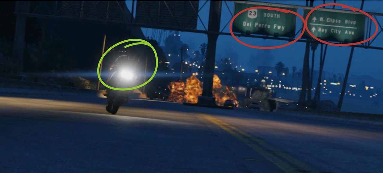 In another short shot we have Franklin speeding away from an explosion on the highway on a sports bike. Above we can see signs for Highway 23, Del Perro Freeway, West Elipse Boulevard and Bay City Avenue.