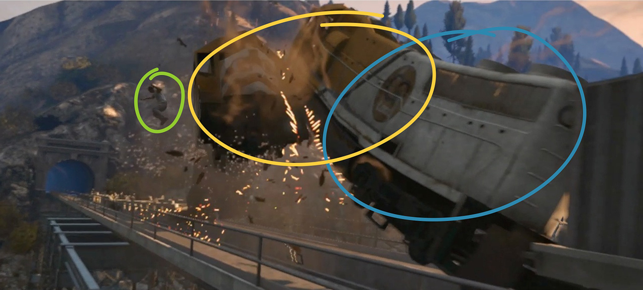 Trevor is still on top of the train in this shot but now it is heading over a bridge, when suddenly it collides with another train head on. sending sparks and debris everywhere and causing so much damage the train bends in the middle, as the trains collide Trevor jumps from the train off the side of the bridge, likely into a body of water below. This may just be a cut scene but hopefully we will be able to wreak this sort of havoc with trains too.