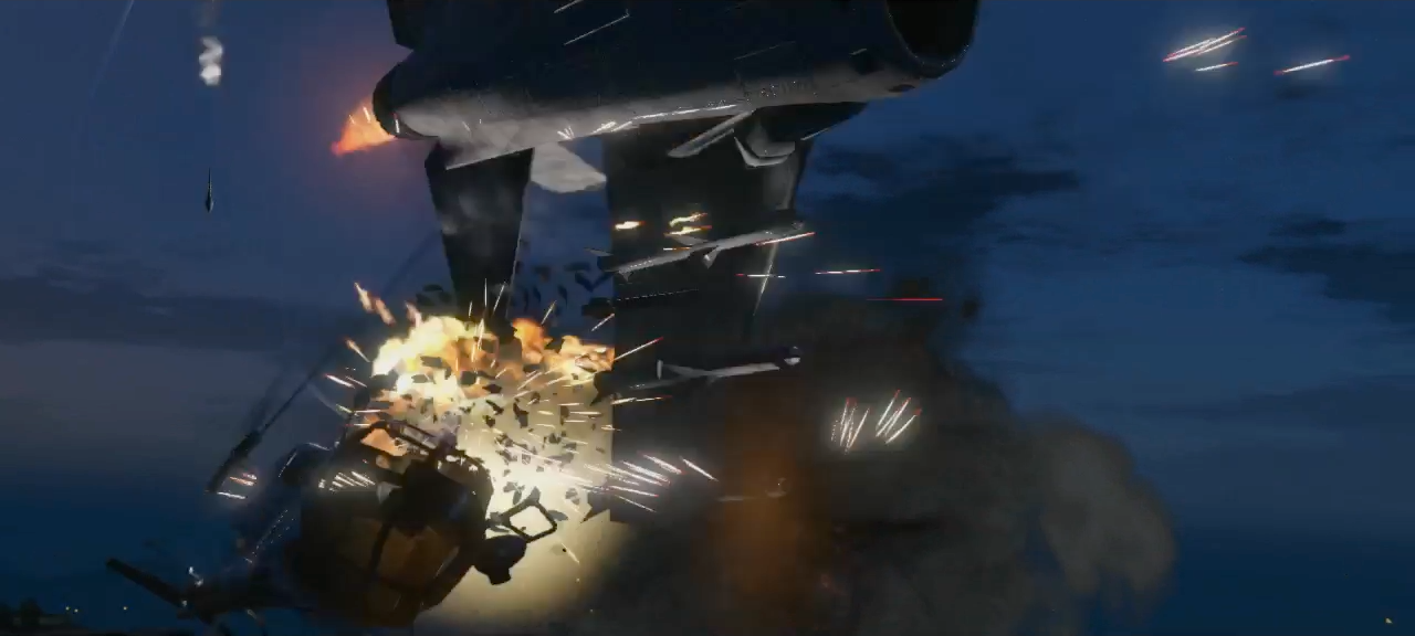 Then the Hydra fires missiles at one of the choppers causing it to explode, it then flies off screen, but not before ripping the helicopter in half by angling it's wing down at the wreckage and smashing through it.